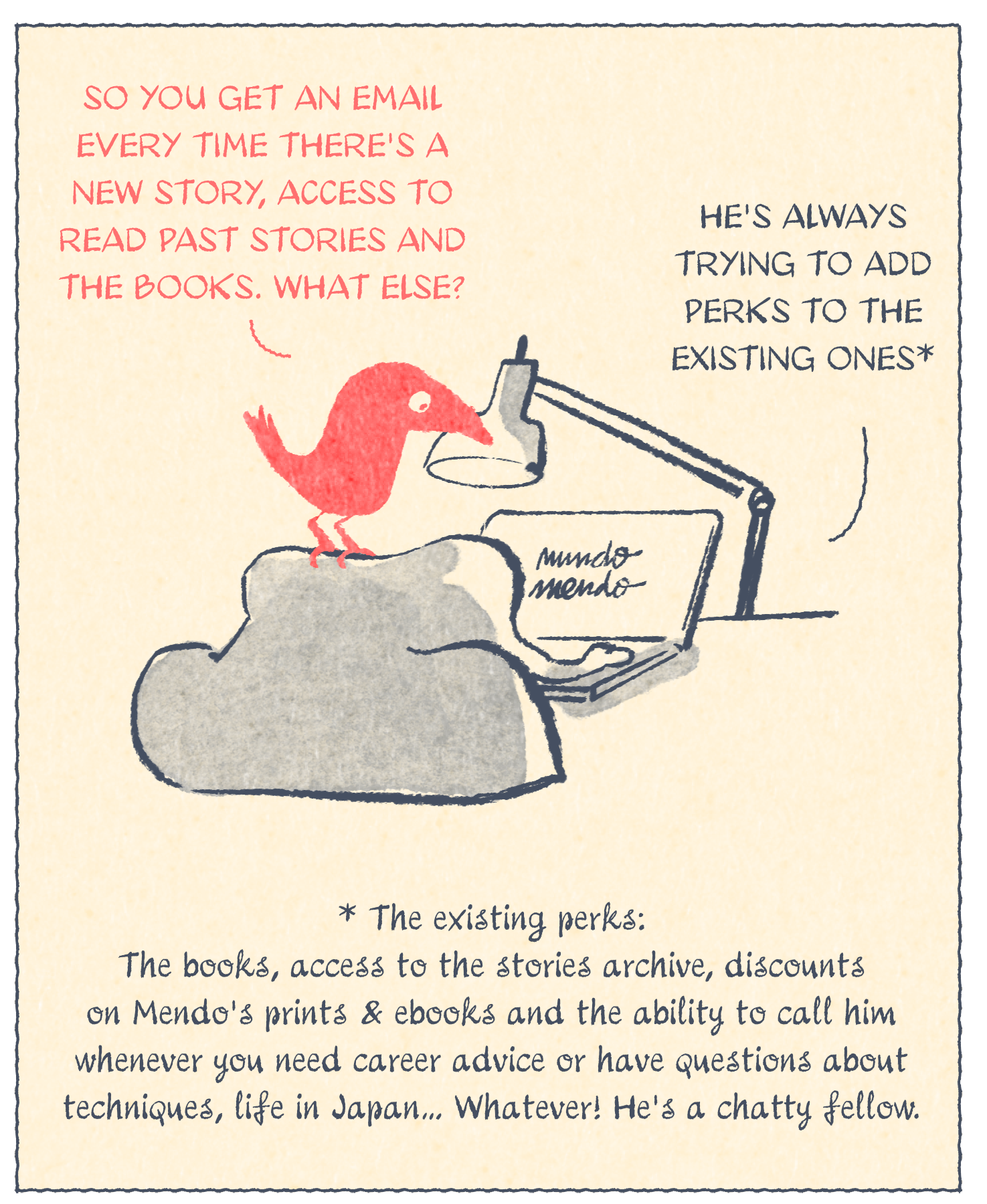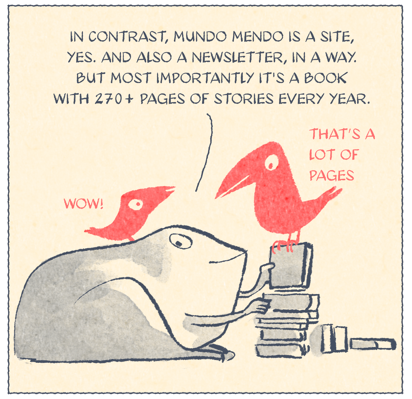 Believe me. I have been searching for months. Trying to find a similar membership program to this Mundo Mendo of mine. One that gives you access to posts AND also gives you a big book every year. I am very surprised, but I haven’t been able to find any. Since there are no other examples, I find myself struggling to explain what this is. A Substack that includes a book? A Newsletter that also comes out on paper? Comics that you can read on screen and on paper? I feel that these definitions fall short.